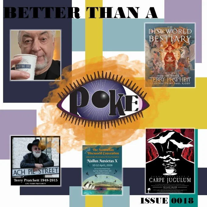 Hotel bookings will soon go on sale for the International Discworld Convention. The Australian Discworld Convention is about to kick off this month and we've got a couple of Discworld plays coming up soon. We look forward to seeing Carpe Jugulum at the Gate Theatre in Cardiff next week. We are going on the Thursday night - if you see us pop over and say hello!